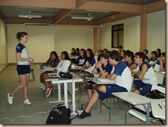 Acredito que o Intercâmbio seja a forma mais perfeita de imersão que existe. Além disto, jamais no decorrer de sua vida, o indivíduo terá capacidade igual de assimilação e circunstâncias tão favoráveis. É portanto a forma mais completa de aprendizado de uma língua e sua cultura. No Centro Educacional São Camilo, uma das escolas em que trabalho, sempre recebemos intercambistas e esse ano estamos com uma intercambista alemã chamada Luisa. Ela veio para o Brasil sem saber o português, e falava o além do alemão o inglês e francês, não teve problemas de comunicação na escola poius muitos alunos falam muito bem o inglês lá e em pouco tempo ela ja estava falando o português. Ela cursa o terceiro ano do ensino médio e se enturmou super bem com a turma, eu propus a ela uma interação maior , pedi que ela preparasse uma apresentação falando sobre a experiencia de ser intercambista aqui no Brasil e que falasse também sobre o seu país e as diferenças culturais entre os dois países e também as suas impressões sobre o Brasil. Ela preparou uma apresentação muito legal e passou para turma e depois abriu espaço para perguntas. Os alunos se divertiram e aprenderam bastante também, pois de forma descontraída conheceram um pouco mais sobre a Alemanha, seus costumes etc. Eu amei a apresentação e os alunos também. A experiência foi tão positiva que pedi que Luisa que fizesse a apresentação para as outras turmas também e o resultado não foi diferente. As fotos abaixo são da apresentação para as turmas do nono ano. Thanks Luisa!!! You´re great!!